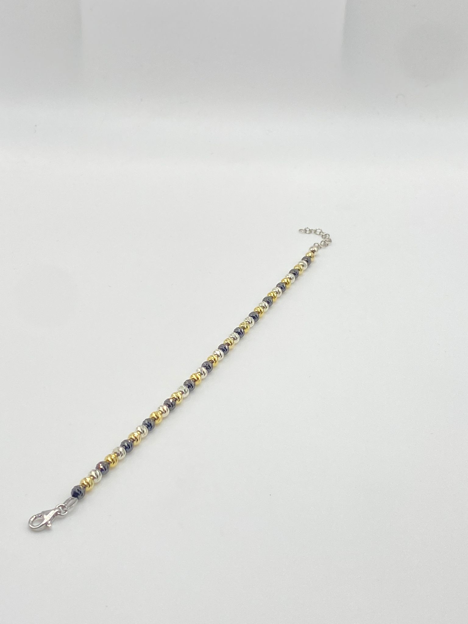 Il contrasto tra il nero , il calore del giallo e la delicatezza del bianco crea un effetto visivo affascinante e dinamico. Ogni singola tonalità è lavorata con cura per riflettere la luce in modo impeccabile, dando vita a un bracciale che scintilla ad ogni movimento. Il design intrecciato di questi tre colori non solo esalta la brillantezza, ma conferisce anche una sensazione di movimento continuo, rendendo il bracciale un accessorio dal fascino senza tempo.