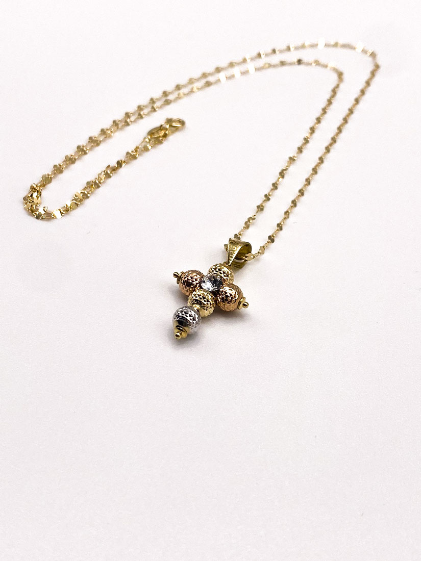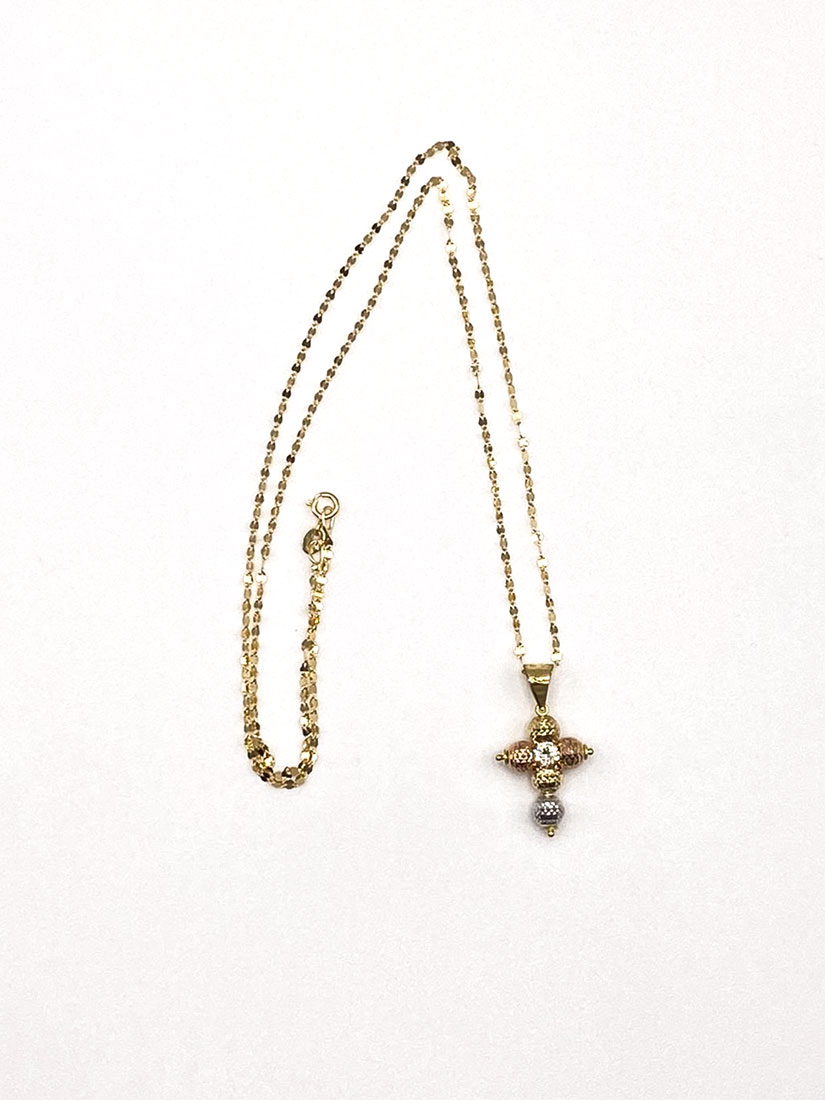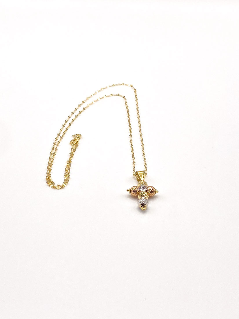La nostra collana milleluci in oro 18kt è un gioiello di rara bellezza, perfetto per esprimere la tua fede e il tuo stile personale. Realizzata con maestria e attenzione ai dettagli, questa collana presenta un pendente a forma di croce composto da tre palline di oro giallo, rosa e bianco, ognuna con una finitura a specchio che riflette la luce in modo spettacolare.