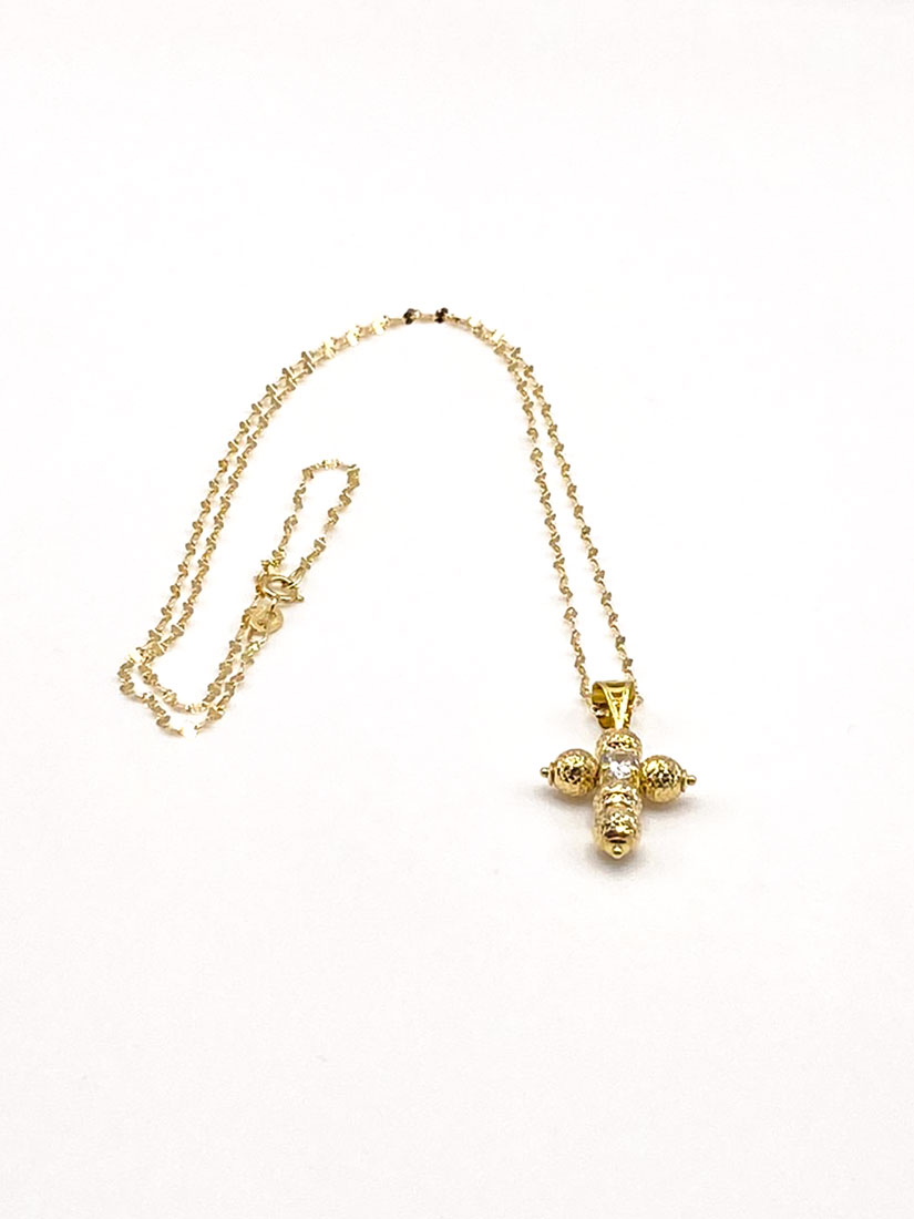 Il design della collana Milleluci è semplice ma elegante, con una catena fine e delicata che termina con un ciondolo a forma di croce. Il ciondolo è decorato con dettagli intricati che aggiungono un ulteriore livello di raffinatezza al gioiello. Questo design versatile rende la collana adatta sia per uomini che per donne, e può essere indossata da sola o abbinata ad altri gioielli per un look più elaborato.